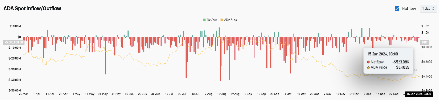Spot flow data adds further context. Persistent outflows continue to outweigh inflows, pointing to ongoing distribution pressure. Although selling intensity softened recently, sellers remain active. Additionally, limited inflows suggest buyers lack strong conviction. Until inflows stabilize and outflows compress, ADA may struggle to sustain a sharp rally.