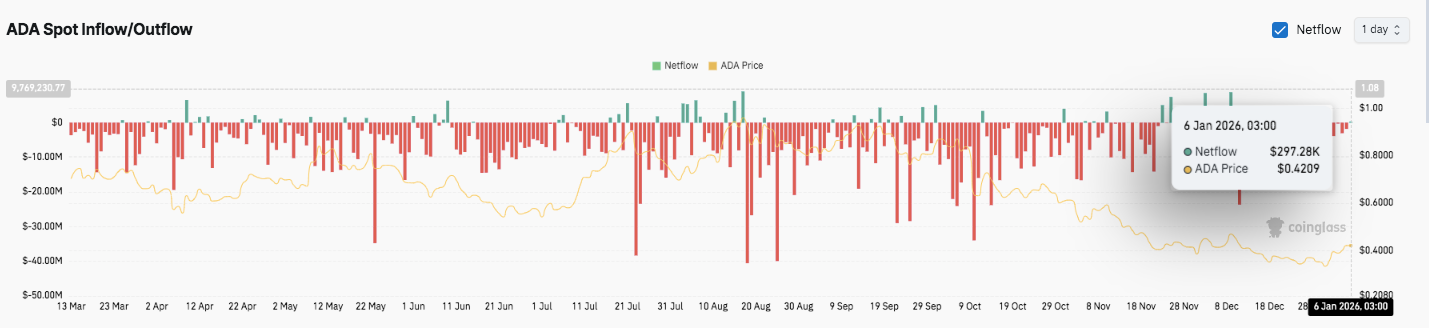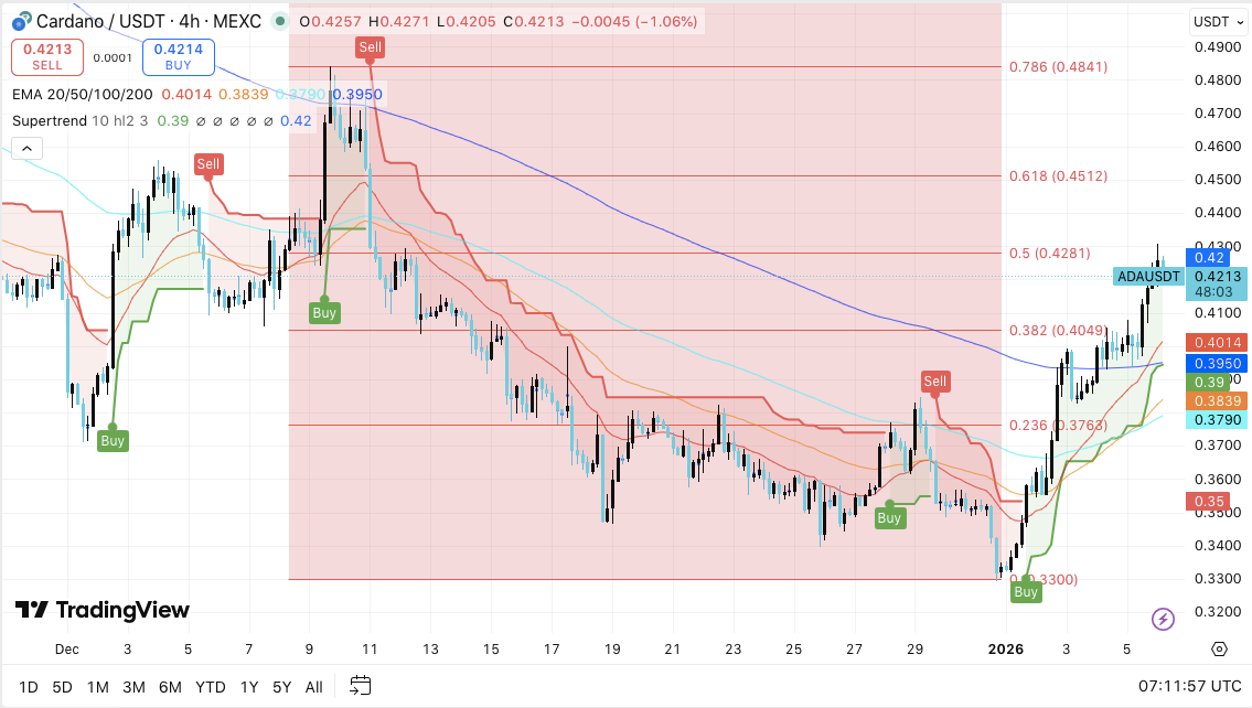 Resistance ceiling: The 200 EMA near $0.42 remains the pivotal level to reclaim for medium-term bullish momentum. ADA trades above shorter EMAs, but failure to flip this ceiling keeps the move corrective.