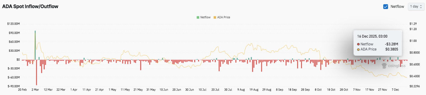 Spot flow trends further reinforce cautious sentiment. ADA has recorded consistent net outflows for an extended period, showing capital leaving exchanges. Although brief inflow spikes appeared, they failed to shift the broader trend.