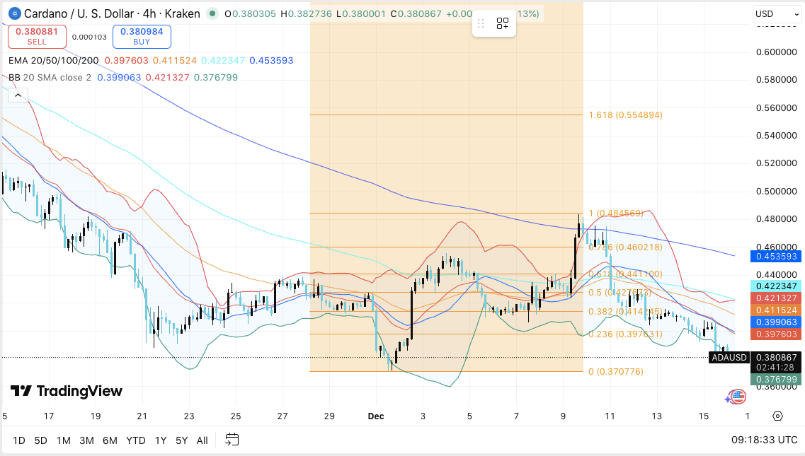 Cardano price continues to face pressure on the four-hour chart as buyers struggle to regain short-term control. ADA trades near the $0.38 level after failing to hold above mid-range resistance earlier this month.