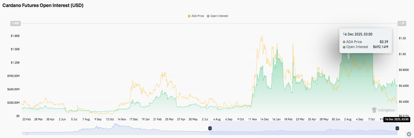 Currently, open interest sits near $690 million while ADA trades around $0.39. This pullback suggests traders reduced leverage after recent volatility. Moreover, the contraction indicates a pause in directional conviction rather than aggressive accumulation. Hence, derivatives data supports a wait-and-see approach across the market.