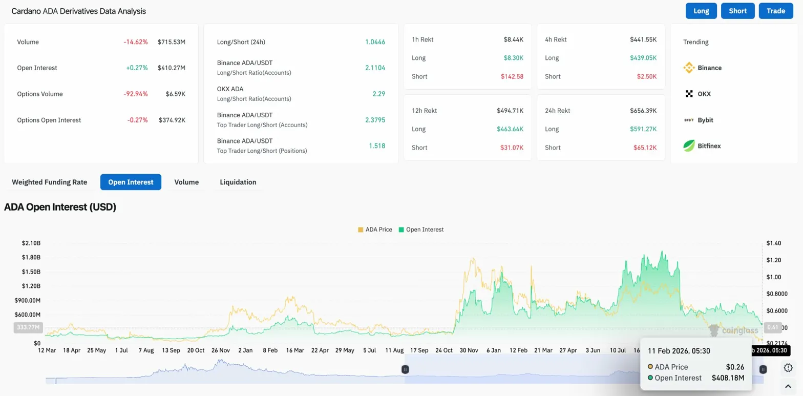 According to Coinglass, Cardano’s open interest increased 0.27% to $410.27M. The uptick appears counterintuitive given the bearish price action, but the data suggests traders are rebuilding positions at these lower levels rather than closing exposure entirely.