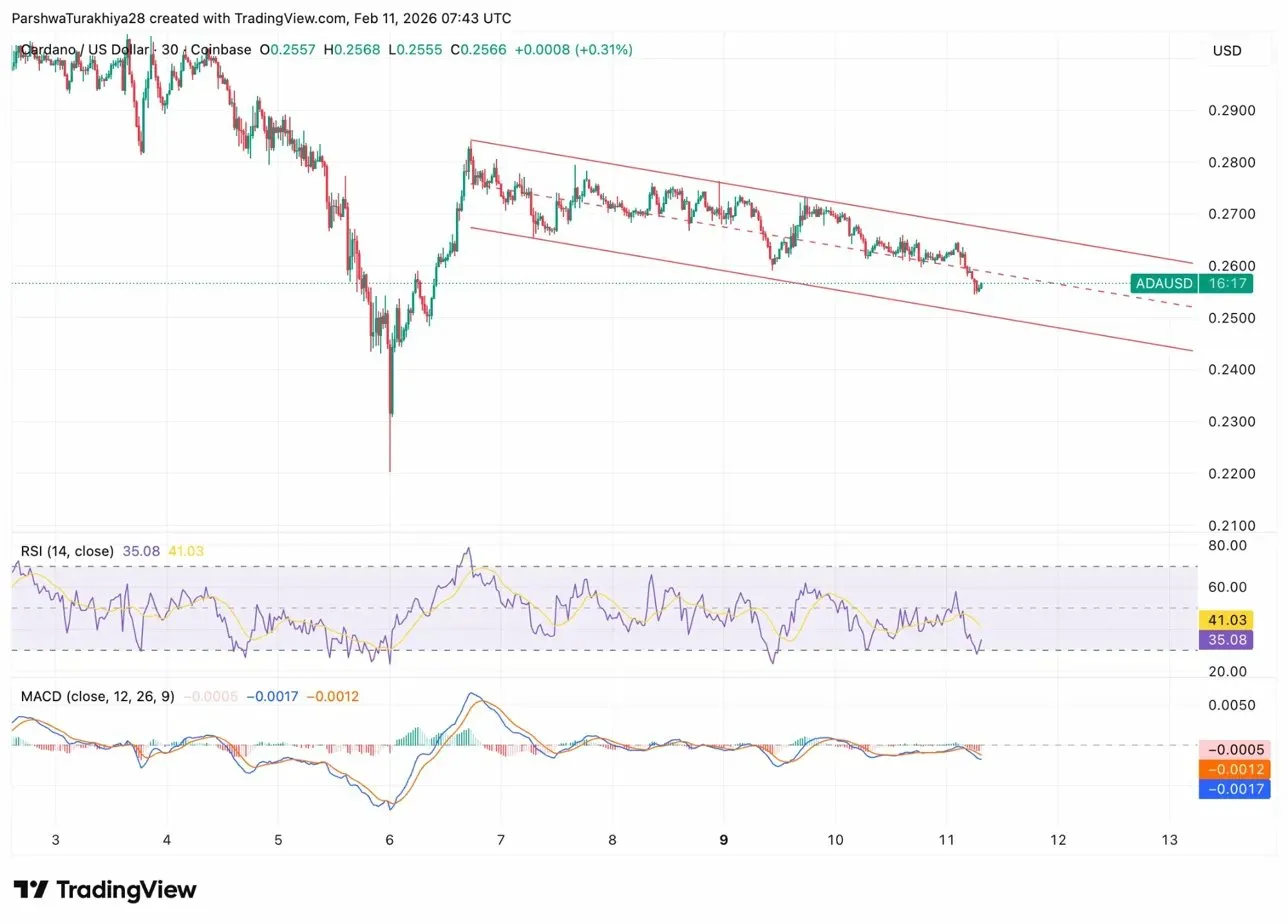 The 30-minute chart shows ADA trapped inside a descending channel pattern, with price testing the lower boundary near $0.2555. RSI sits at 35.08, approaching oversold conditions but not yet showing reversal signals. MACD remains negative with the histogram printing red bars and both lines trending downward.