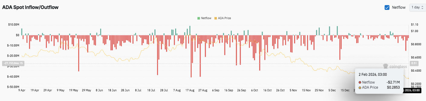 Besides weak price action, technical indicators and flow data reinforce a cautious outlook. Traders appear reluctant to build aggressive positions, while sellers continue to defend key resistance zones. Consequently, ADA remains vulnerable to further downside unless buyers regain critical levels and improve momentum conditions.