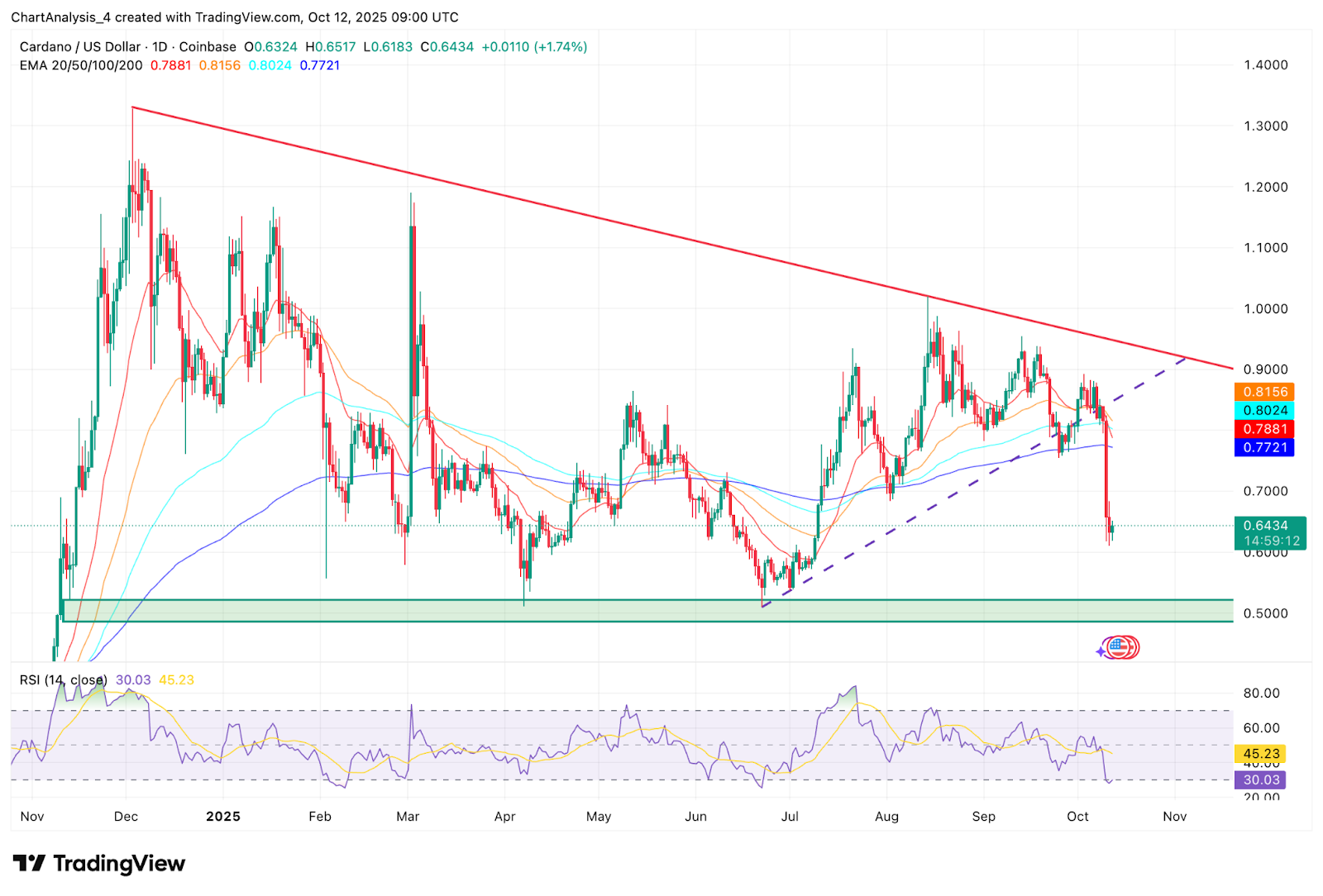 Cardano price today is consolidating near $0.64, attempting to stabilize after falling over 20% this week. The move follows heavy liquidations that drove ADA below its rising trendline and 20/50/100/200 EMAs clustered between $0.77 and $0.82. Buyers are now defending the $0.60–$0.62 area, which marks the last structural support before the $0.50 base seen in April.