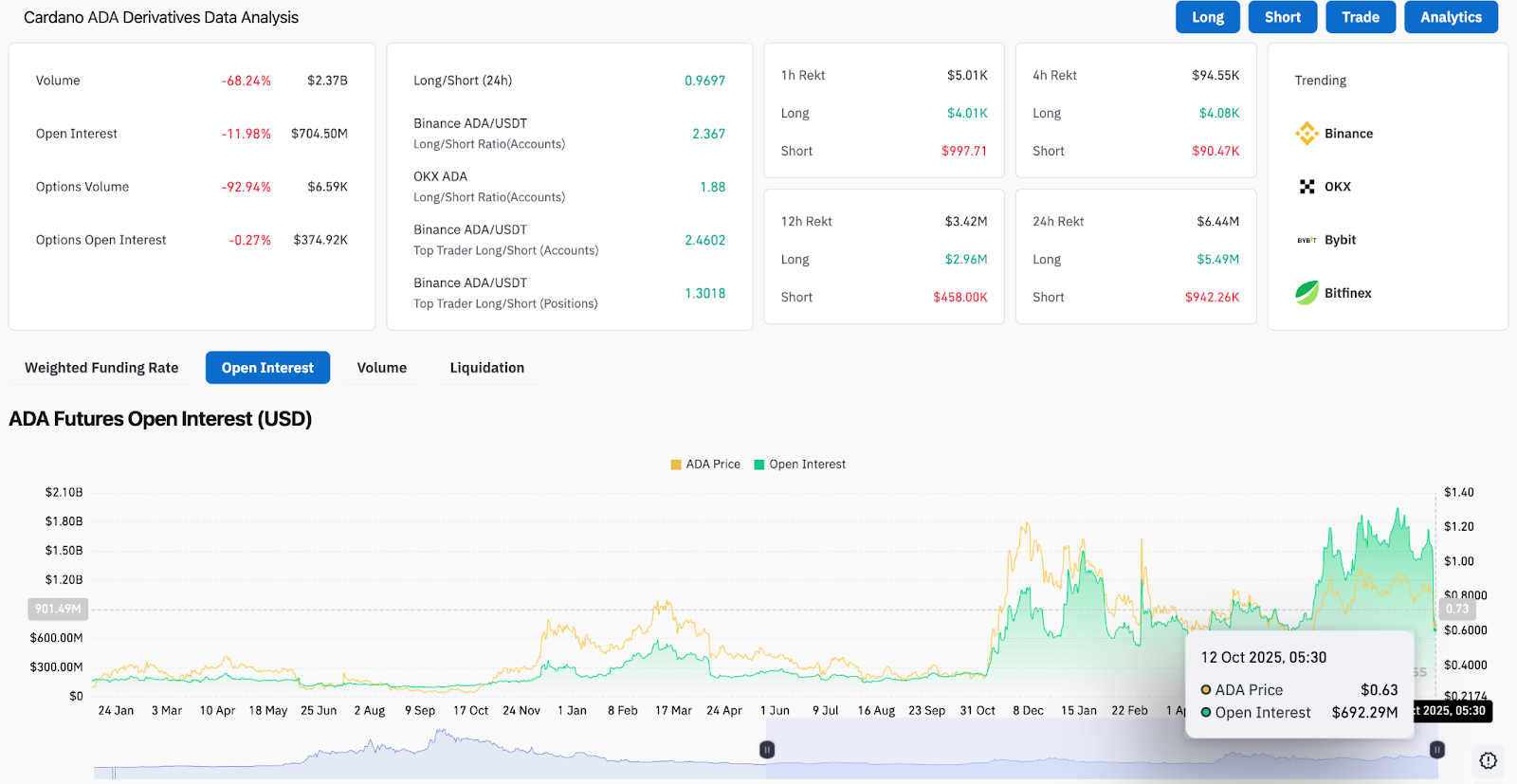According to Coinglass data, Cardano’s open interest has fallen nearly 12% to about $704 million as traders unwind leveraged positions. Volume collapsed over 68% to $2.37 billion, while options volume plunged more than 90%.