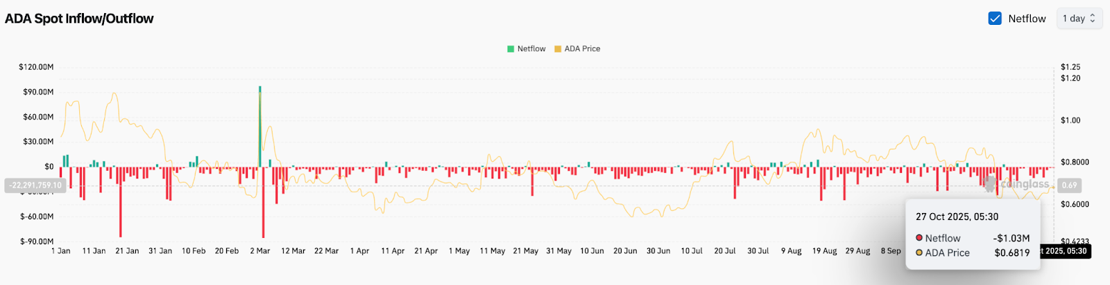 Coinglass data shows that ADA spot netflows on October 27 recorded outflows of $1.03 million, extending a pattern of mild selling pressure seen through most of the month. Yet compared with larger outflows from early September, the scale of recent withdrawals appears more controlled.