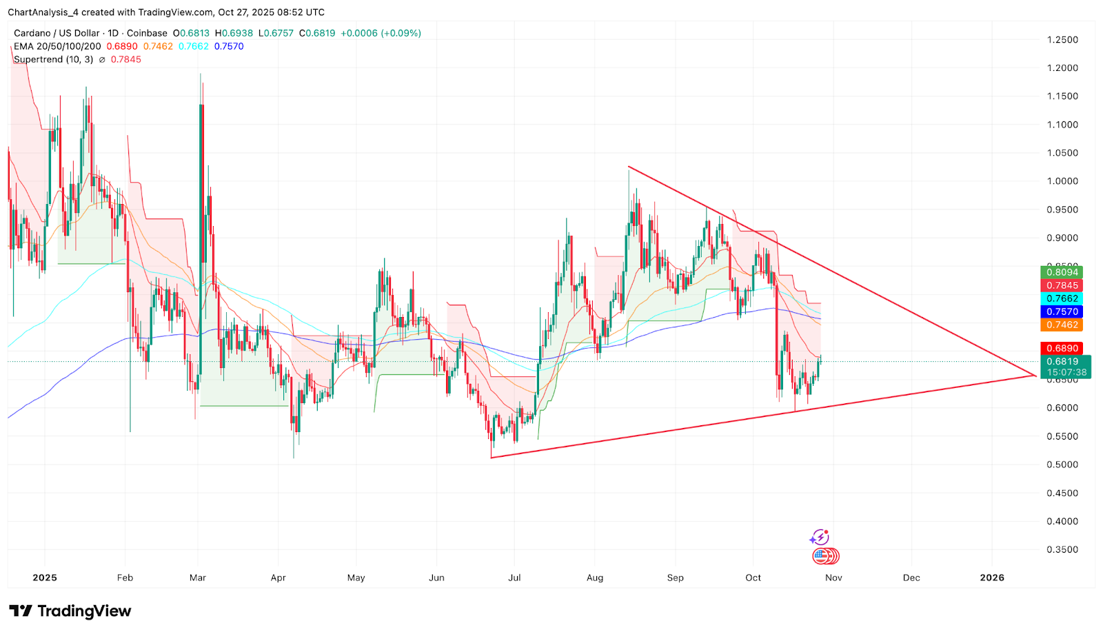Cardano price today trades near $0.6819, holding its ground after rebounding from October lows around $0.65. The token continues to trade inside a tightening symmetrical triangle, with both bulls and bears awaiting a decisive breakout that could define its next major move into November.