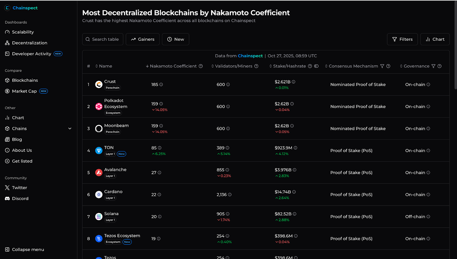 Beyond its price, Cardano’s network fundamentals continue to underpin investor conviction. According to Chainspect’s latest decentralization data (Oct 27, 2025), Cardano ranks sixth among the most decentralized blockchains with a Nakamoto Coefficient of 22, supported by over 2,100 validators and a $14.74 billion stake.