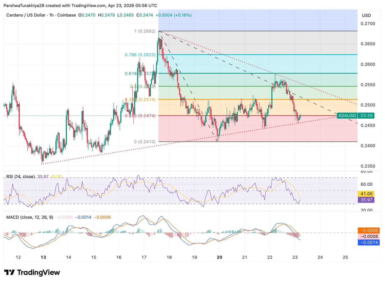 - Downside: 0.236 Fib breaks on a 1H close, MACD stays negative, and ADA drops to the retracement base at $0.2410. A break below $0.2410 puts the wedge floor near $0.2375 in view with nothing meaningful in between.