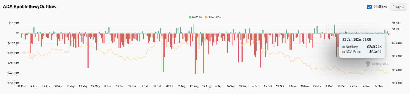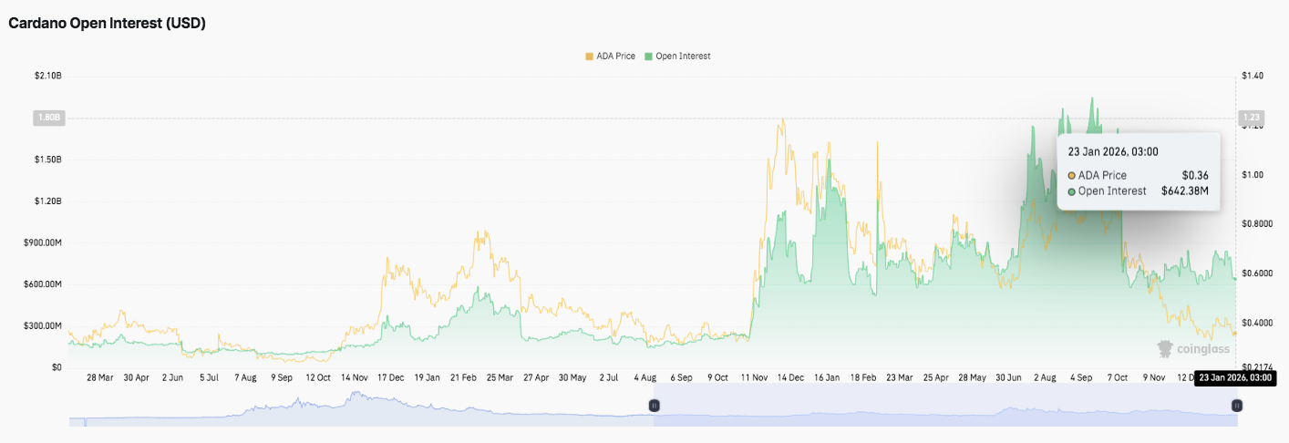 Cardano’s open interest shows a full leverage cycle, moving from buildup to expansion, then cooling off. OI surged above $1 billion during the rally phase, then declined as ADA pulled back. Significantly, OI has stabilized near $642 million, which suggests consolidation instead of fresh risk-taking.