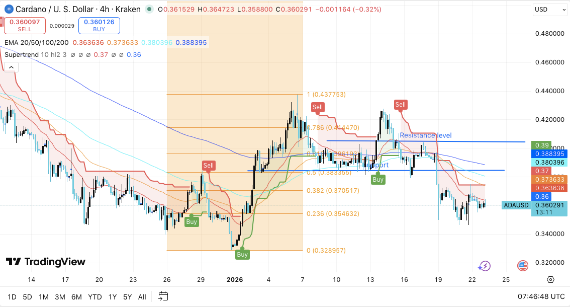 Key levels remain clearly defined for Cardano as ADA consolidates near $0.36 after a sharp pullback. The short-term structure still favors sellers, with price holding below key moving averages and printing lower highs. However, ADA is also sitting on an important base, meaning the next breakout or breakdown could set the tone for the coming sessions.