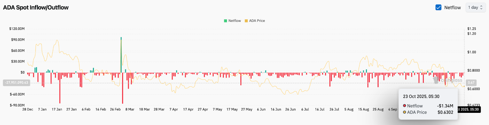 Data from Coinglass shows consistent negative spot netflows through October, including a $1.34 million outflow on October 23 as ADA price hovered near $0.63. These outflows indicate coins moving back to exchanges, often a sign of cautious positioning or profit-taking.