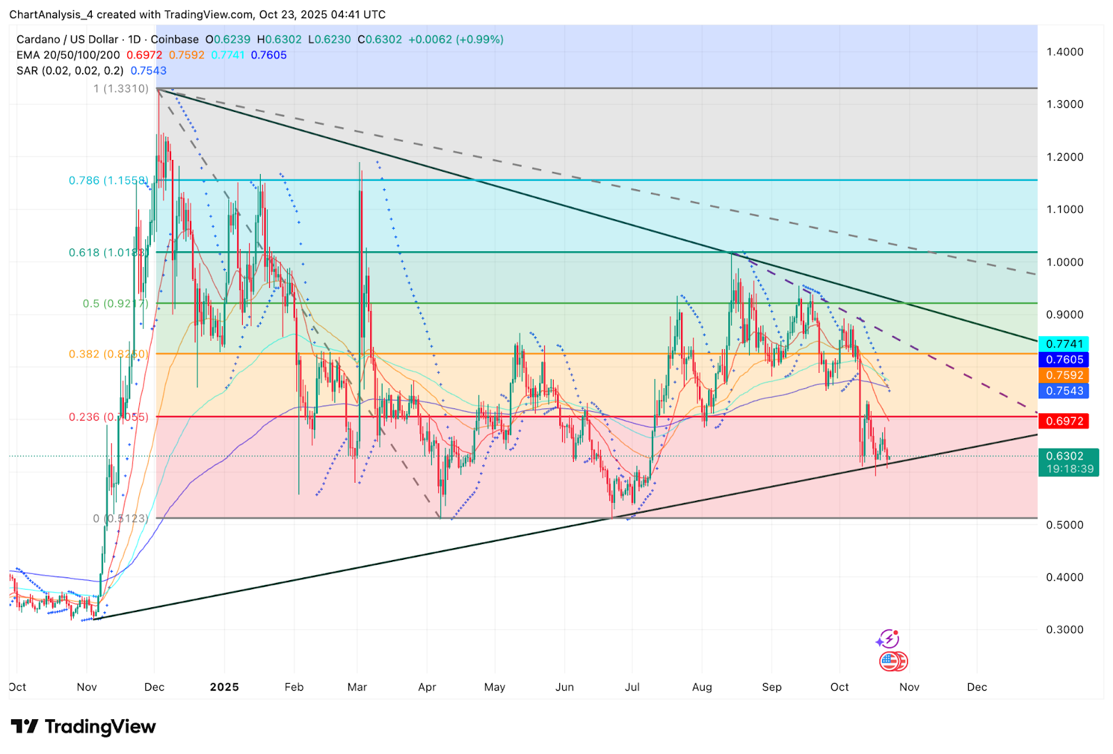 Cardano price today trades around $0.63, holding slightly above a key ascending trendline that has supported its structure since late 2024. Despite sustained selling pressure and weak inflows, the coin remains within a broader symmetrical triangle that continues to compress between resistance near $0.77 and long-term support at $0.60.
