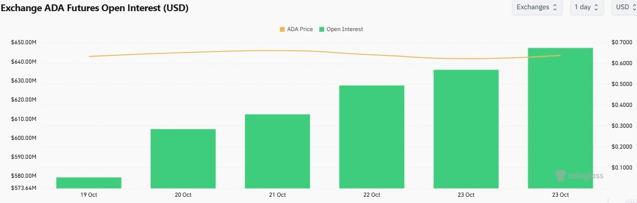 The large-cap altcoin, with a fully diluted valuation of about $28.8 billion, has signaled a bullish outlook amid rising calls for altseason 2025. Notably, Cardano’s Futures Open Interest (OI) has exponentially increased from $579 million to around $647 million in the past six days.