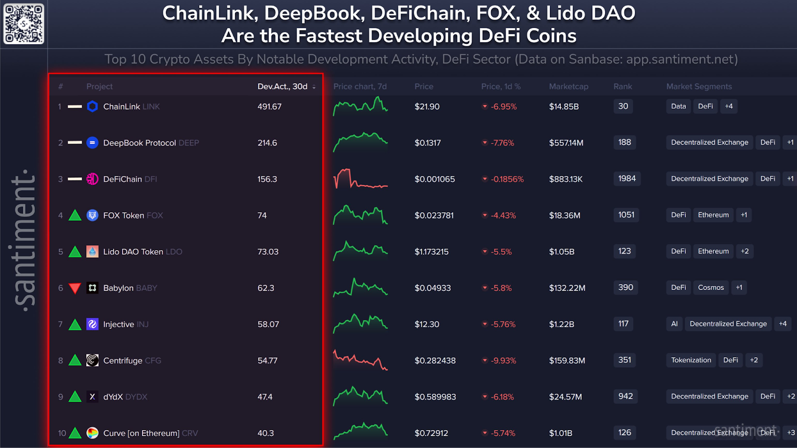 According to recent data from Santiment, ChainLink remains the top DeFi project in terms of development activity over the past 30 days, boasting an impressive score of 491.67.