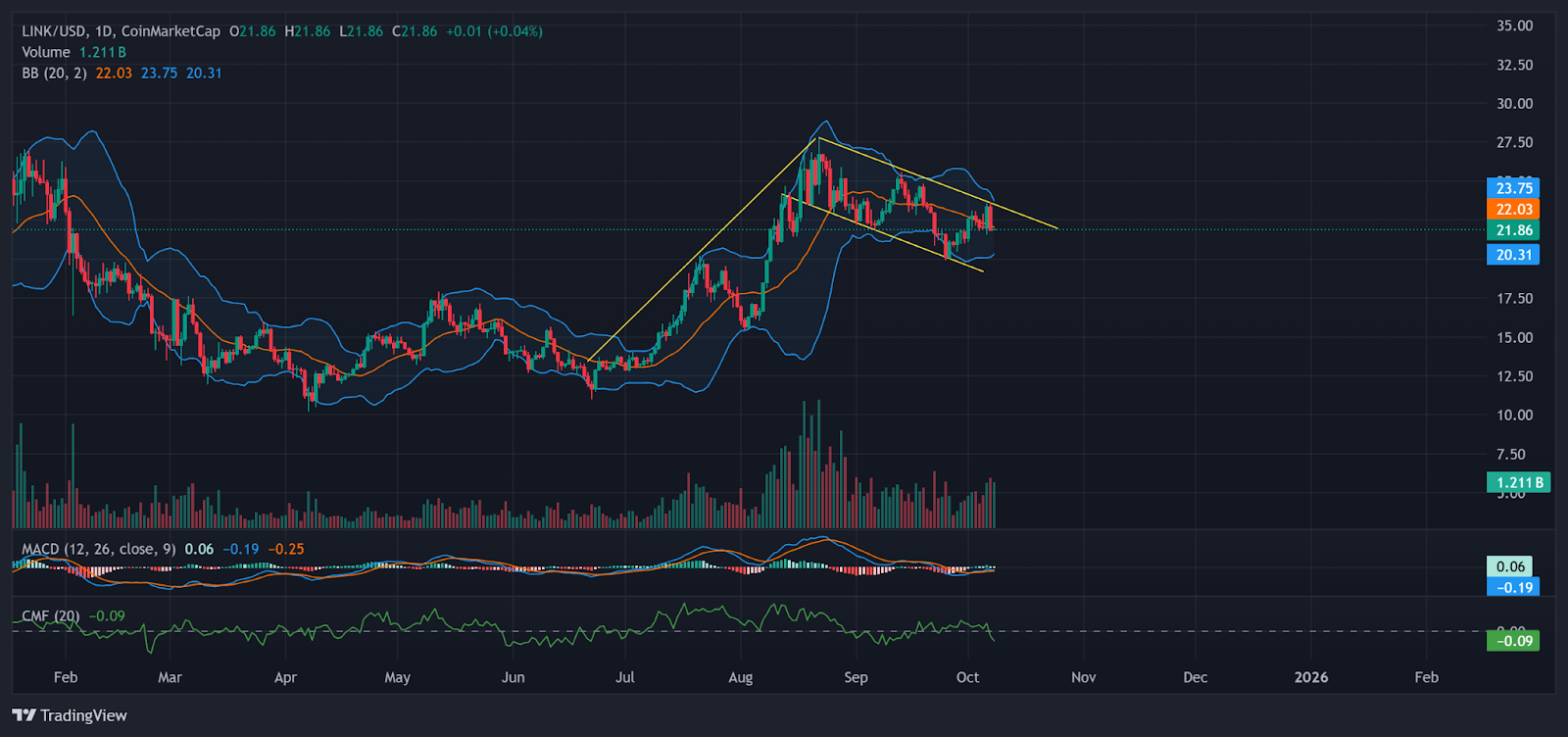 On the other hand, if LINK breaks below the $20 support, it may trigger further correction toward the $17.5 level. Bollinger Bands indicate tightening volatility, hinting that a significant move may be imminent.