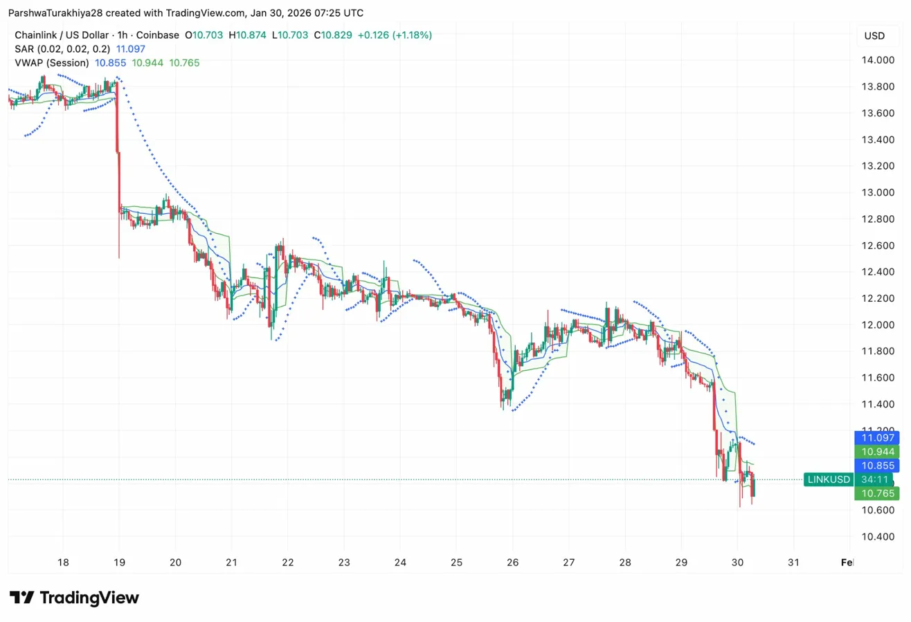 On the hourly chart, LINK shows a clear downtrend from the January 18 high near $14. The Parabolic SAR remains bearish at $11.09, while price trades below session VWAP at $10.85.
