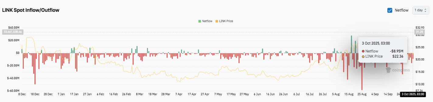 However, despite upward price movement, LINK has experienced sustained net outflows from exchanges throughout 2025. Several spikes exceeded $40 million, particularly in mid-August and late September, while inflows remained limited.