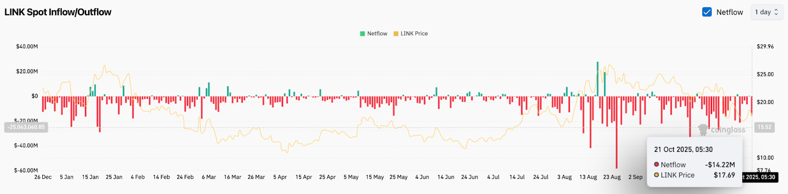 - Net outflows of $14M highlight weak demand, with persistent selling pressure keeping LINK price volatility elevated.