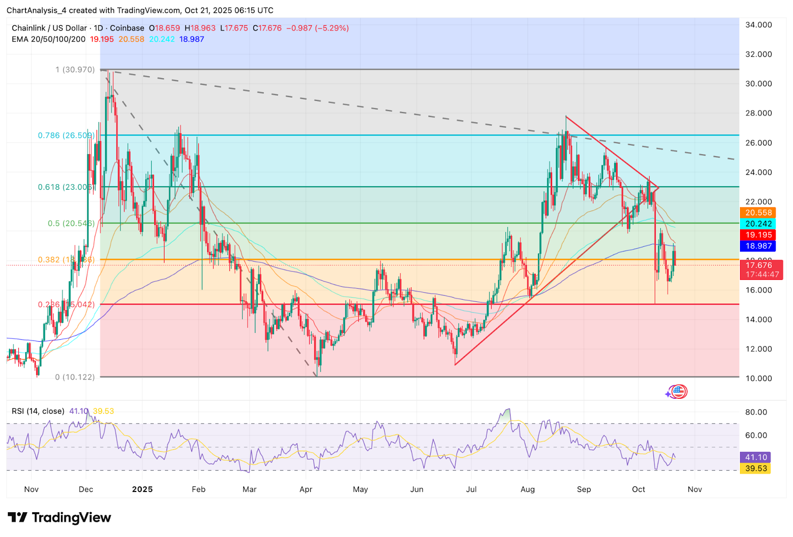 The LINK price action shows a decisive rejection from the 50-day EMA near $20.20. After failing to sustain above the 0.382 Fibonacci retracement level at $18.62, sellers drove the token back toward the $17 handle.
