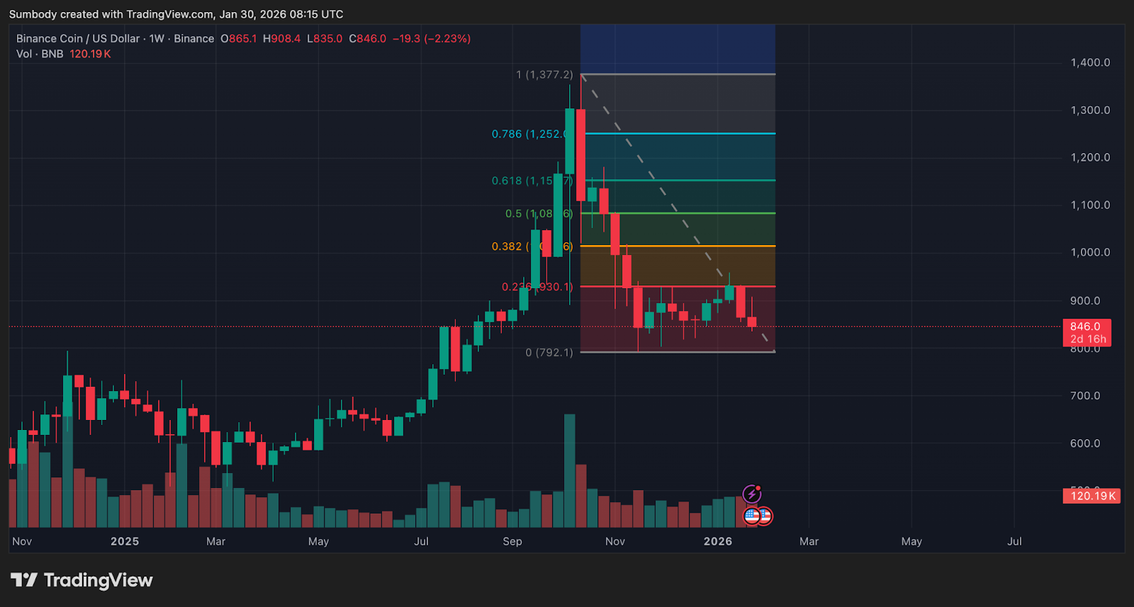 BNB traded at $846 at the time of writing, reflecting a 38% pullback from an all-time high of $1,375, which it achieved in October 2025.