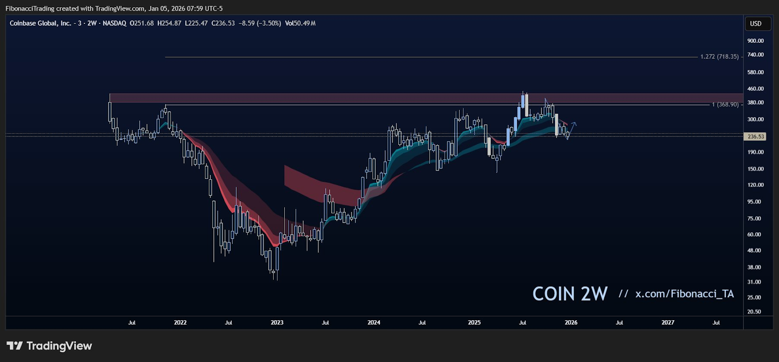 According to market analyst FibonacciTrading, COIN stocks have more upside potential in the near term. The analyst says that if the COIN price on the 2-weekly chart reclaims the EMA Cloud as support, a bull rally akin to the 2025 rally will be imminent.