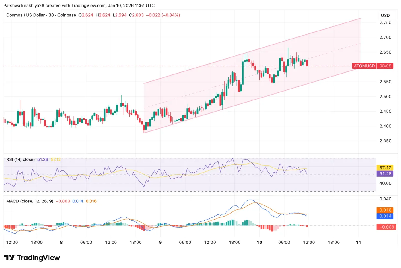 Shorter timeframes show ATOM consolidating inside a rising channel between $2.55 and $2.70. The RSI reads 51.28, neutral after reaching overbought levels above 70 during the initial breakout. The MACD shows slight bearish divergence at negative 0.003, suggesting momentum is pausing rather than extending immediately.