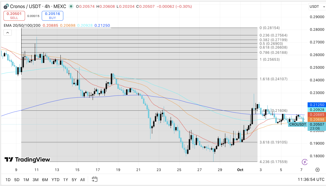 Cronos (CRO) is navigating a consolidation phase after rebounding from late-September lows, with its price holding near $0.205. The cryptocurrency’s movement between the 20-day and 50-day exponential moving averages (EMA) suggests a tug-of-war between buyers and sellers. Despite subdued price action, trading activity across derivatives has accelerated, pointing to renewed speculative interest and potential volatility in the near term.