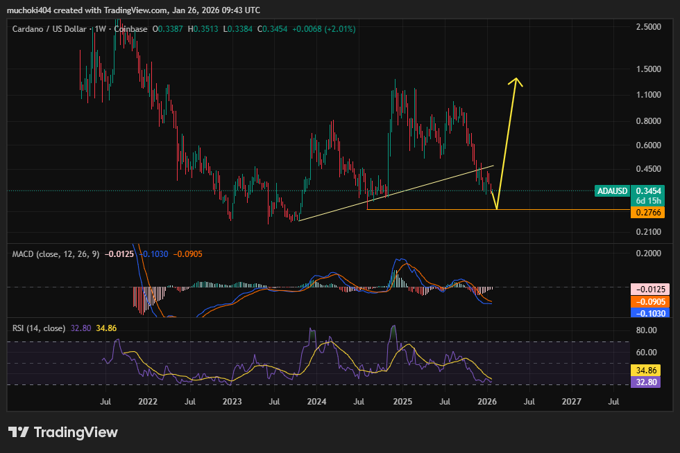 However, technical analysis shows the ADA/USD pair is under midterm bearish pressure with a target of about $0.27 before a bullish rebound happens.