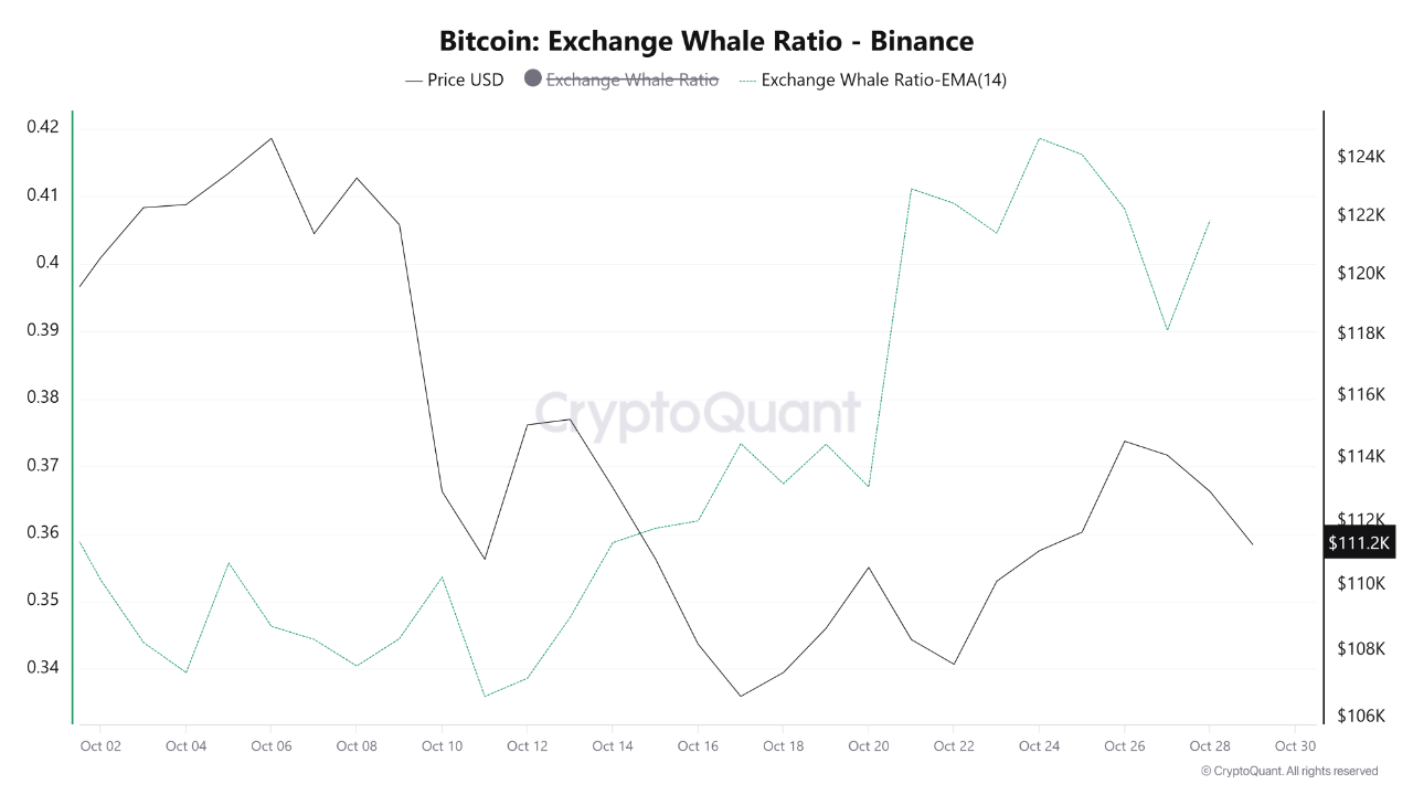 Data from CryptoQuant shows that Binance’s Exchange Whale Ratio, a measure of how much BTC large holders are sending to exchanges, has been climbing steadily since mid-October.