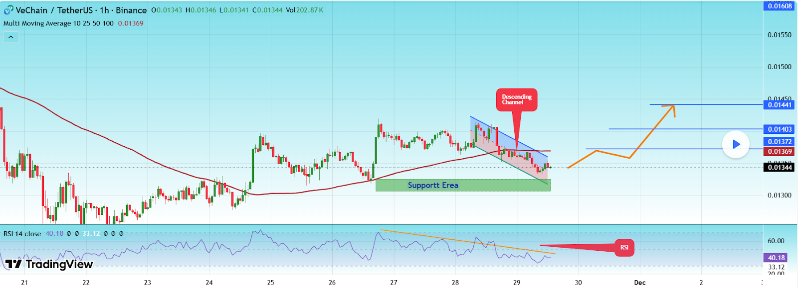 The main support level to watch is $0.01320, a zone where VET has repeatedly held and bounced. If the price continues to stabilize above the 100-hour moving average, the short-term trend could turn positive.