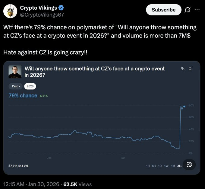 One widely shared post claimed to show a prediction market contract on Polymarket related to a hypothetical incident involving CZ at a future crypto event. The post displayed a probability near 79% and trading volume of roughly $7 million.