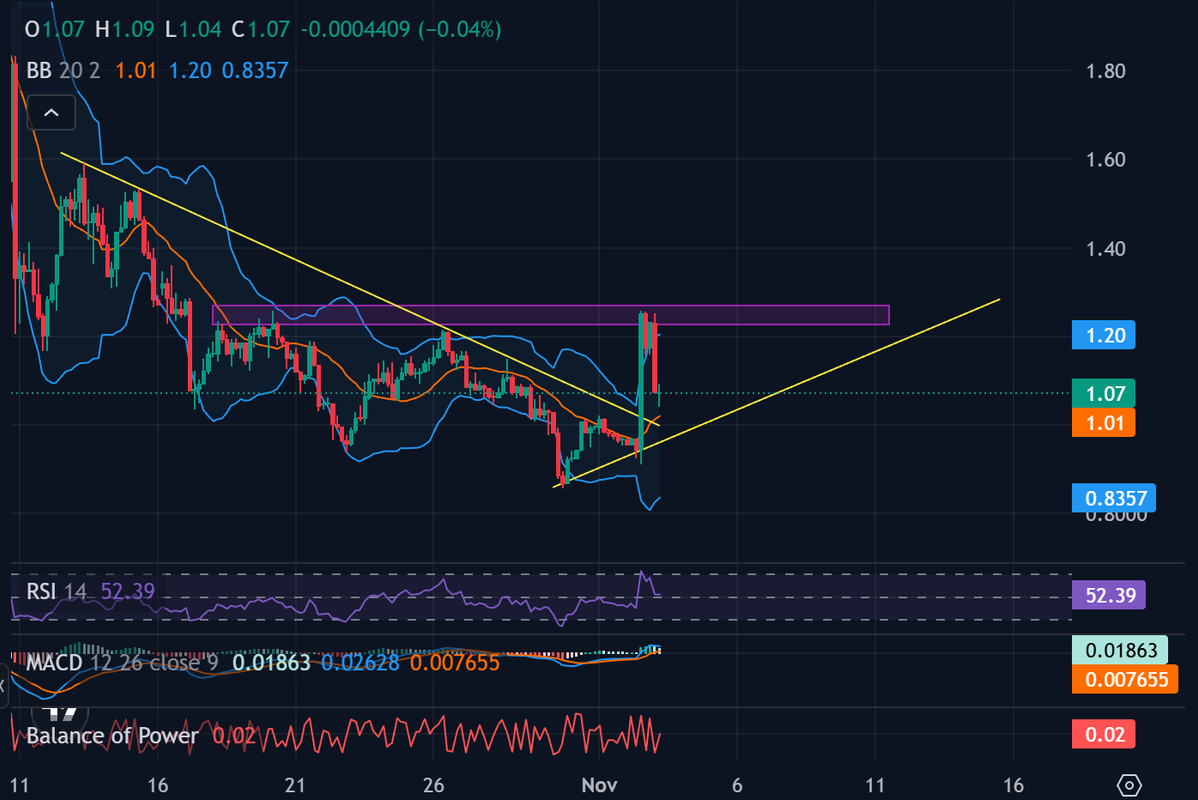 A sustained move above the resistance zone at $1.20 could open the door to a short-term bullish target of $1.35–$1.40. However, failure to hold the current trendline support around $1.01 might trigger a pullback toward $0.83.