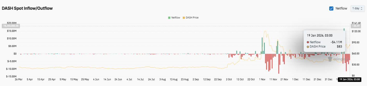 Derivatives data also shows renewed positioning. DASH open interest stayed muted for months, then expanded sharply during the breakout phase. After a cooldown tied to a pullback, open interest has started rising again. It reached around $181.6 million in mid-January, while price hovered near $78.