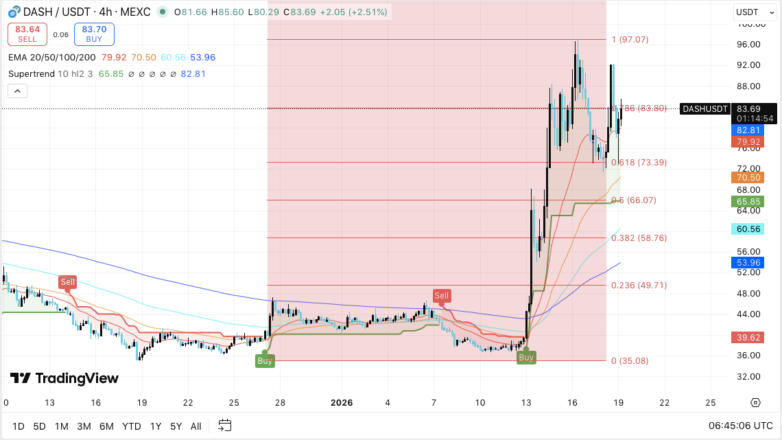 Dash (DASH) is gaining traction again after a sharp breakout from the $35 base and a steady climb on the 4-hour chart. Market watchers said the move reflects strong continuation demand, with price recently trading near $83.7.
