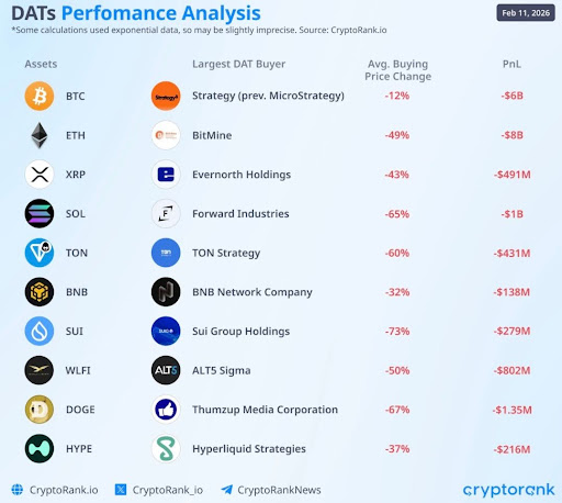 According to market data from CoinRank, Strategy Inc. has led other DATs in a drop of at least 12% from their average buying price. BitMine, which has a portfolio dominated by heavy Ethereum (ETH), is already down 49%, with an unrealized PnL of about $8 billion.