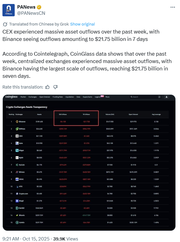 Die Schlagzeile der CoinGlass-Dashboards, die 21,75 Milliarden US-Dollar an siebentägigen Abflüssen bei Binance zeigten, gab die Erzählung vor, so dass die Berechnungsmethode über ihre Bedeutung entscheiden musste.