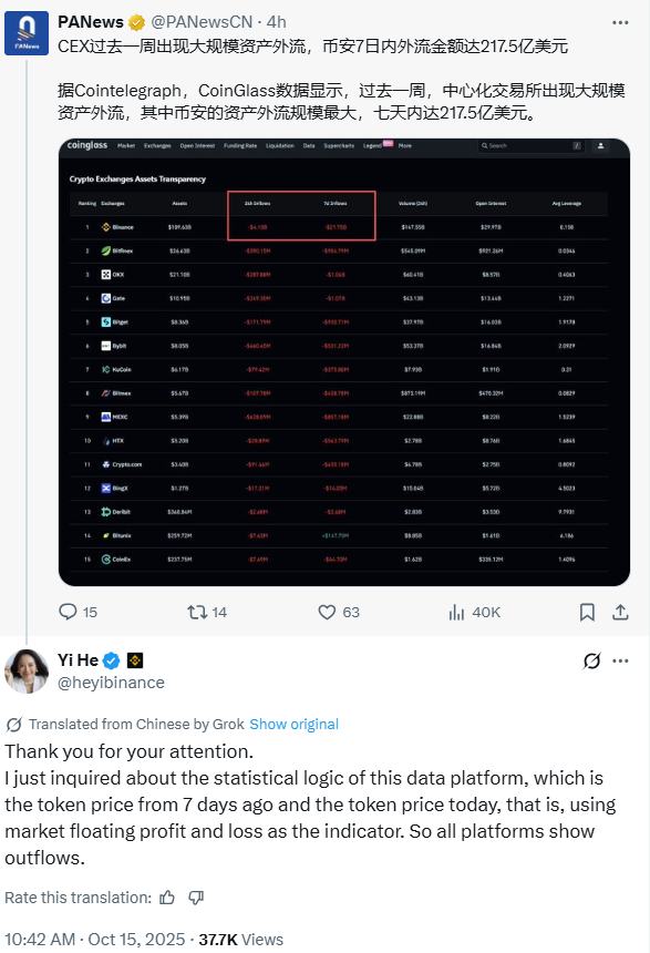 - Berichte zeigten, dass 21,75 Mrd. $ Binance in 7 Tagen verließen; Yi He sagte, die Zahl stamme aus der Preis-Wirkungs-Mathematik, nicht aus Abhebungen.
