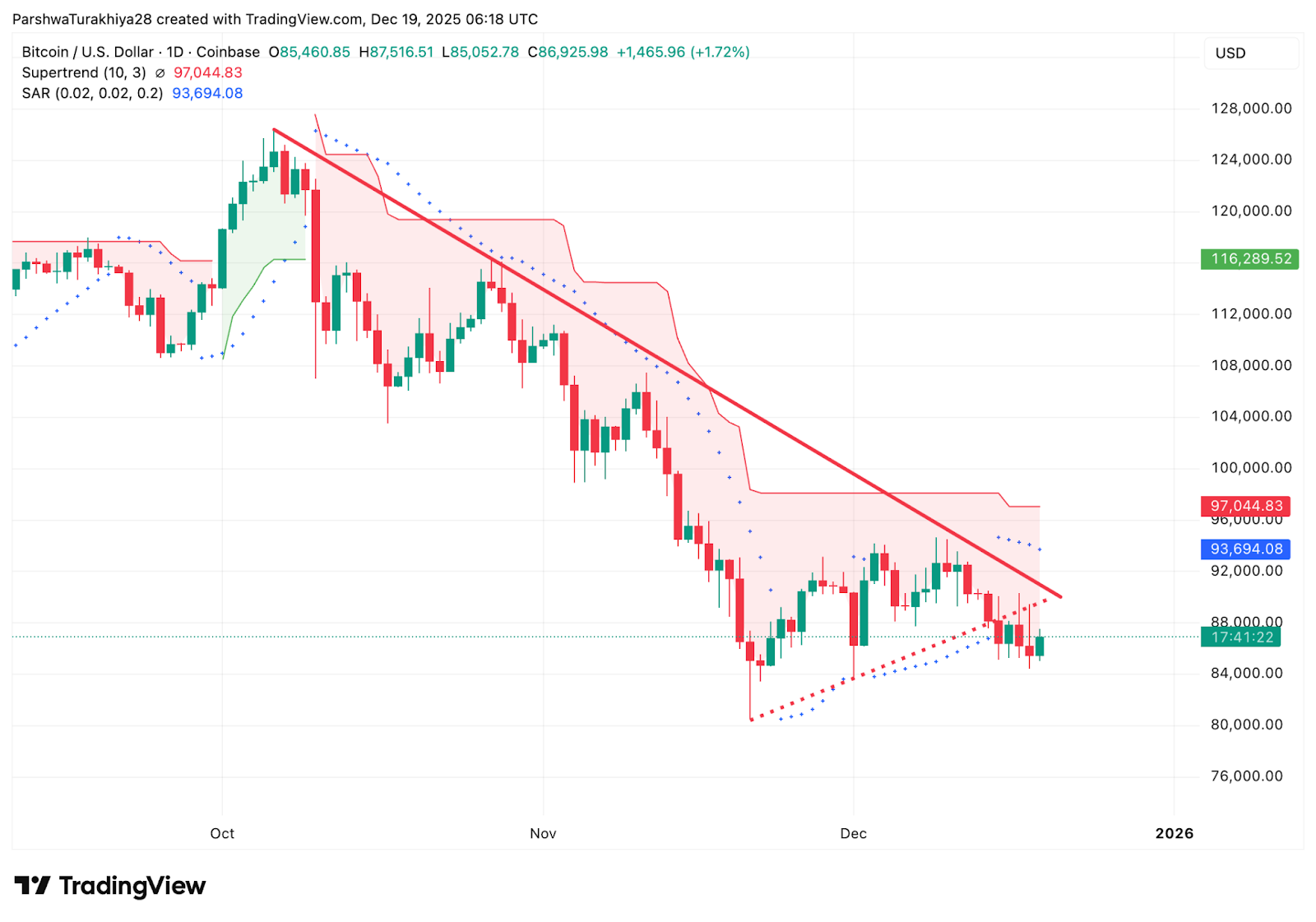 Der Supertrend-Indikator bleibt bärisch, mit einem Widerstand von etwa 97.000 US-Dollar, weit über dem aktuellen Preis. Parabolische SAR-Punkte bleiben ebenfalls über den Kerzen, was darauf hindeutet, dass sich die Trendbedingungen nicht gedreht haben.