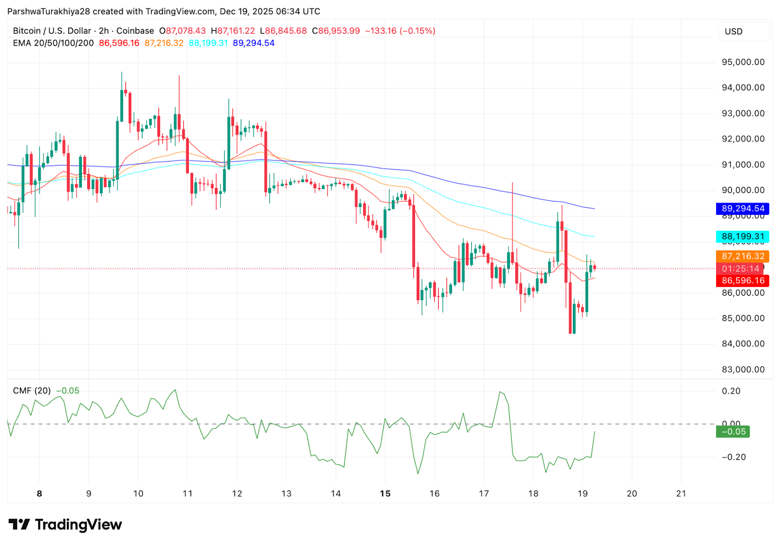 Kürzere Zeitrahmen verstärken dieselbe Botschaft. Im 2-Stunden-Chart handelt Bitcoin unterhalb der großen EMAs, die eng zwischen 86.600 und 89.300 $ liegen.