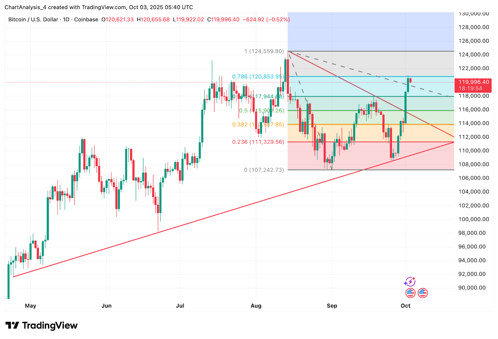 Der Bitcoin-Preis wird heute bei 119.996 $ gehandelt und konsolidiert sich nach einer explosiven Rallye von 111.000 $ knapp unter dem Widerstandscluster von 120.800 $. Die Erholung hat BTC wieder auf den höchsten Stand seit Wochen gebracht, aber das Momentum steht vor einem wichtigen Test am 0,786 Fibonacci-Retracement und der absteigenden Trendlinie.