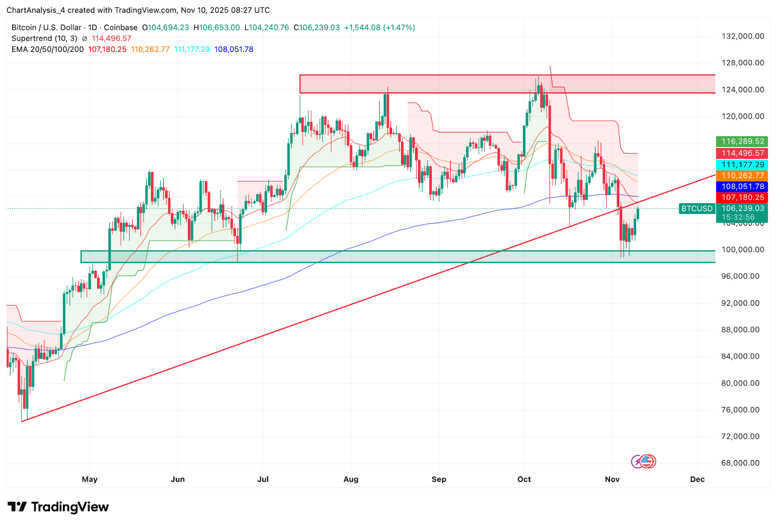 Der Bitcoin-Preis wird heute in der Nähe von 106.239 $ gehandelt und erholt sich damit von dem Zusammenbruch der letzten Woche unter die mehrmonatige aufsteigende Trendlinie, die den gesamten Anstieg im Jahr 2025 unterstützte. Die Verkäufer trieben den Preis in den Nachfragebereich von 100.000 bis 98.500 $, wo die Käufer das Niveau aggressiv verteidigten. Die Risikostimmung verbesserte sich nach den jüngsten Äußerungen von Donald Trump, die darauf hindeuteten, dass der Shutdown in den USA bald enden könnte.
