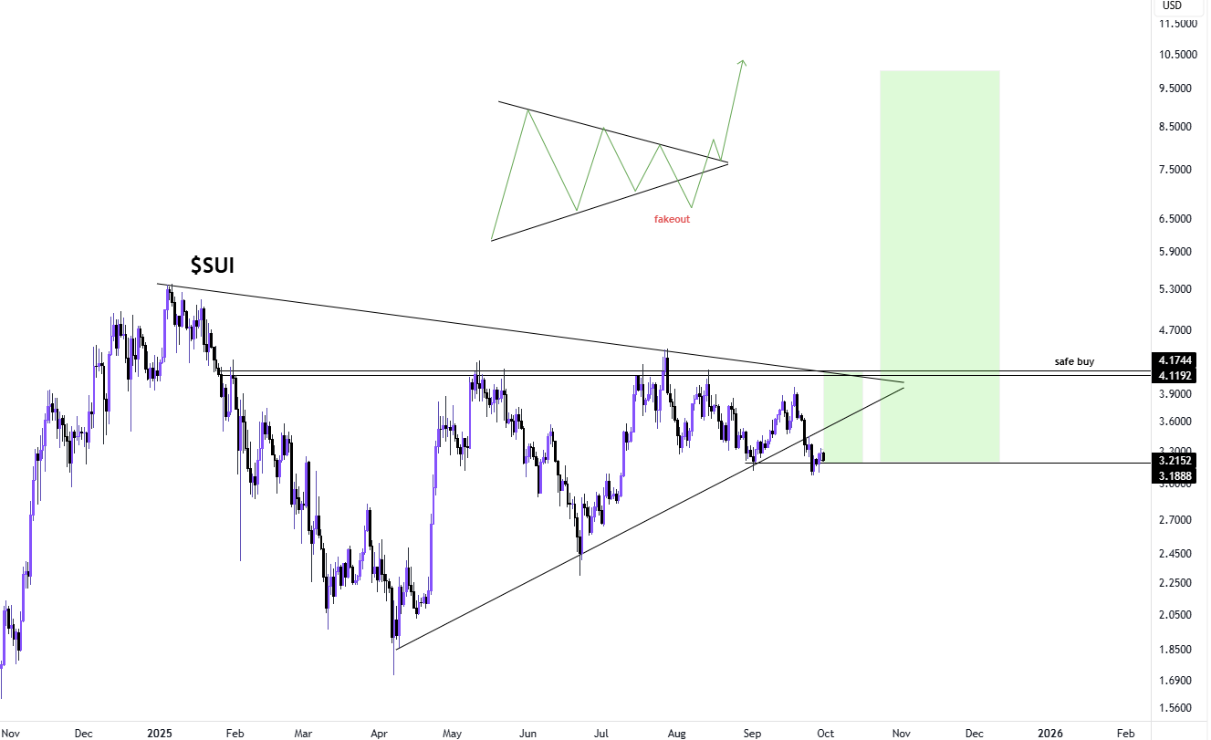 Das $SUI Wochenchart zeigt eine stetige Akkumulationsphase, wobei sich höhere Tiefs über der Unterstützungszone von 2,63 $ bis 2,79 $ bilden. Dieses Niveau hat sich als widerstandsfähig erwiesen und spiegelt Muster wider, die vor seinem letzten Ausbruch zu beobachten waren.