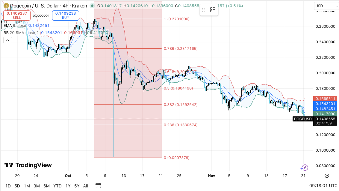 DOGE bleibt in einem kontrollierten Abwärtstrend gefangen. Verkäufer verteidigen jeden Rebound, und das Diagramm zeigt eine konstante Ablehnung auf wichtigen Fibonacci-Niveaus. Das 0,382-Retracement nahe 0,159 $ beendete mehrere Erholungsversuche, während die Zonen 0,5 und 0,618 weiterhin das Momentum blockieren. Der Preis handelt unterhalb des EMA-9, der stark nach unten fällt.