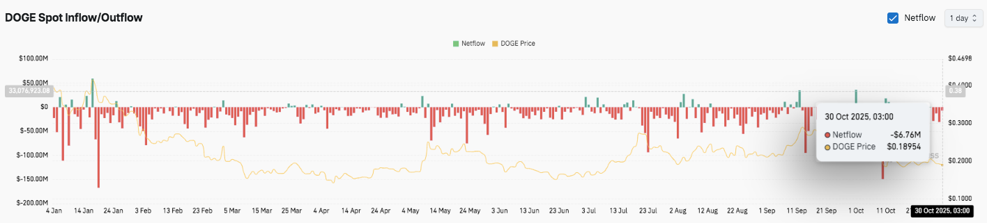 Die Spotmarktdaten von Dogecoin zeigen außerdem kontinuierliche Abflüsse, die sich am 30. Oktober 2025 auf insgesamt 6,76 Millionen US-Dollar beliefen. Dieser Trend zeichnet ein Gewinnmitnahmeverhalten und eine begrenzte Akkumulation bei den Anlegern aus. Darüber hinaus verringern anhaltende Abflüsse die Liquiditätsstützung und gehen häufig einer schwächeren Preiserholung voraus.