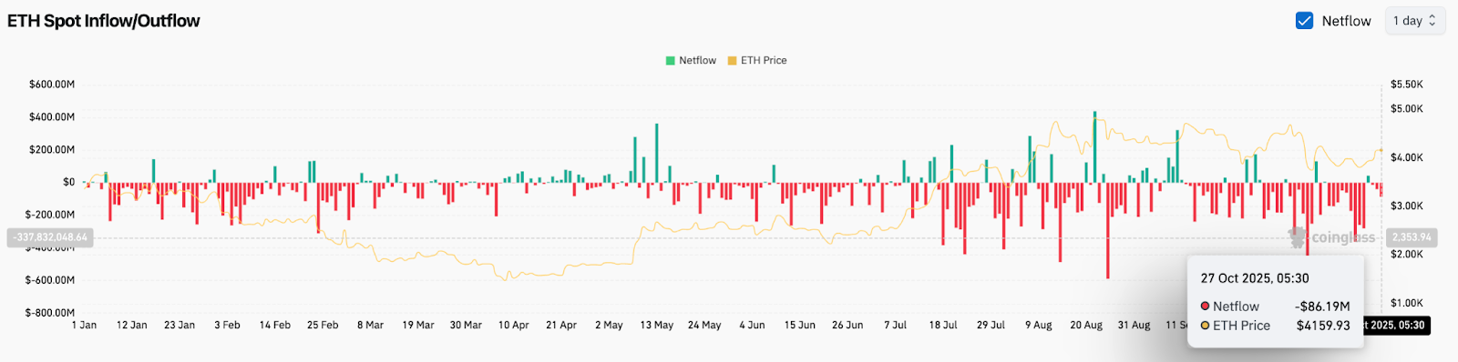 Die Ethereum-Spot-Daten zeigen Nettoabflüsse in Höhe von 86,19 Mio. $ am 27. Oktober, was den fünften Tag in Folge mit negativen Wechselkurszuflüssen markiert. In den letzten zwei Wochen beliefen sich die Abflüsse auf durchschnittlich über 200 Millionen US-Dollar täglich, was eine anhaltende Verknappung des Liquiditätsangebots unterstreicht.