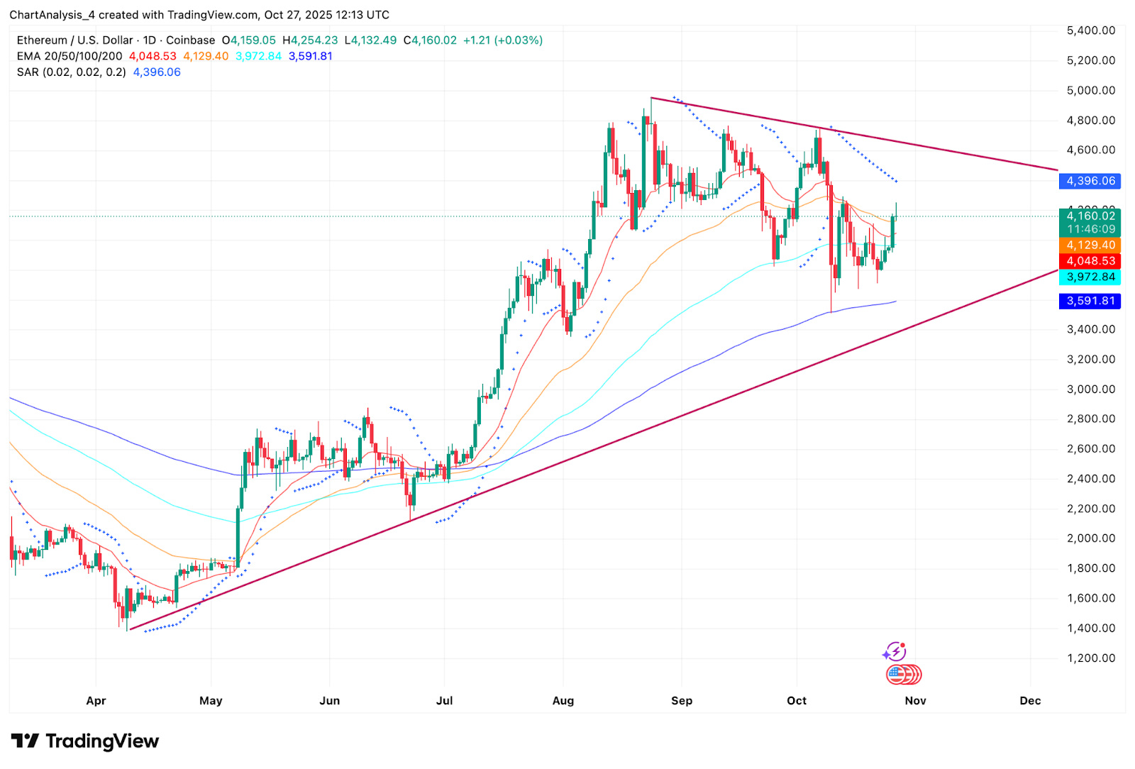 Der Ethereum-Preis wird heute in der Nähe von 4.160 $ gehandelt und hält sich damit über den kurzfristigen gleitenden Durchschnitten, da sich die Marktstimmung nach einem volatilen Oktober stabilisiert. Der Vermögenswert konsolidiert sich innerhalb eines großen symmetrischen Dreiecks, wobei die Käufer versuchen, den Preis wieder in Richtung des oberen Widerstands bei 4.396 $ zu drücken. Die wichtigste Spannung besteht nun zwischen wachsender Derivateaktivität und Abflüssen aus weichen Spots, die die Aufwärtsüberzeugung weiterhin belasten.