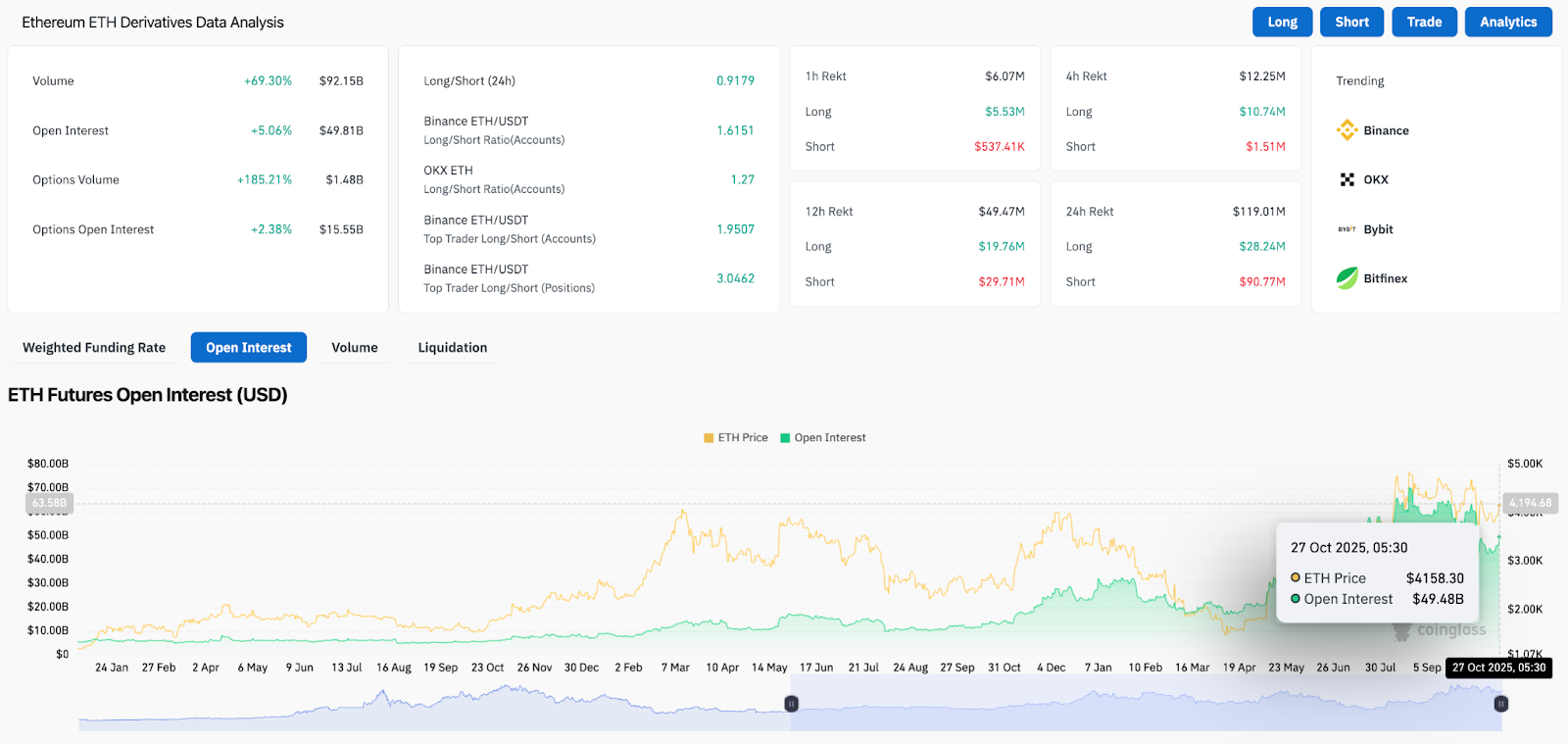 Die Derivatehändler sind wieder aktiv geworden. Die Daten zeigen, dass das Open Interest von Ethereum um 5,06% auf 49,81 Mrd. $ gestiegen ist, während das Gesamtvolumen in den letzten 24 Stunden um 69% auf 92,15 Mrd. $ gestiegen ist. Das Optionsvolumen stieg ebenfalls um 185% auf 1,48 Mrd. $, was auf einen erneuten spekulativen Appetit hindeutet.