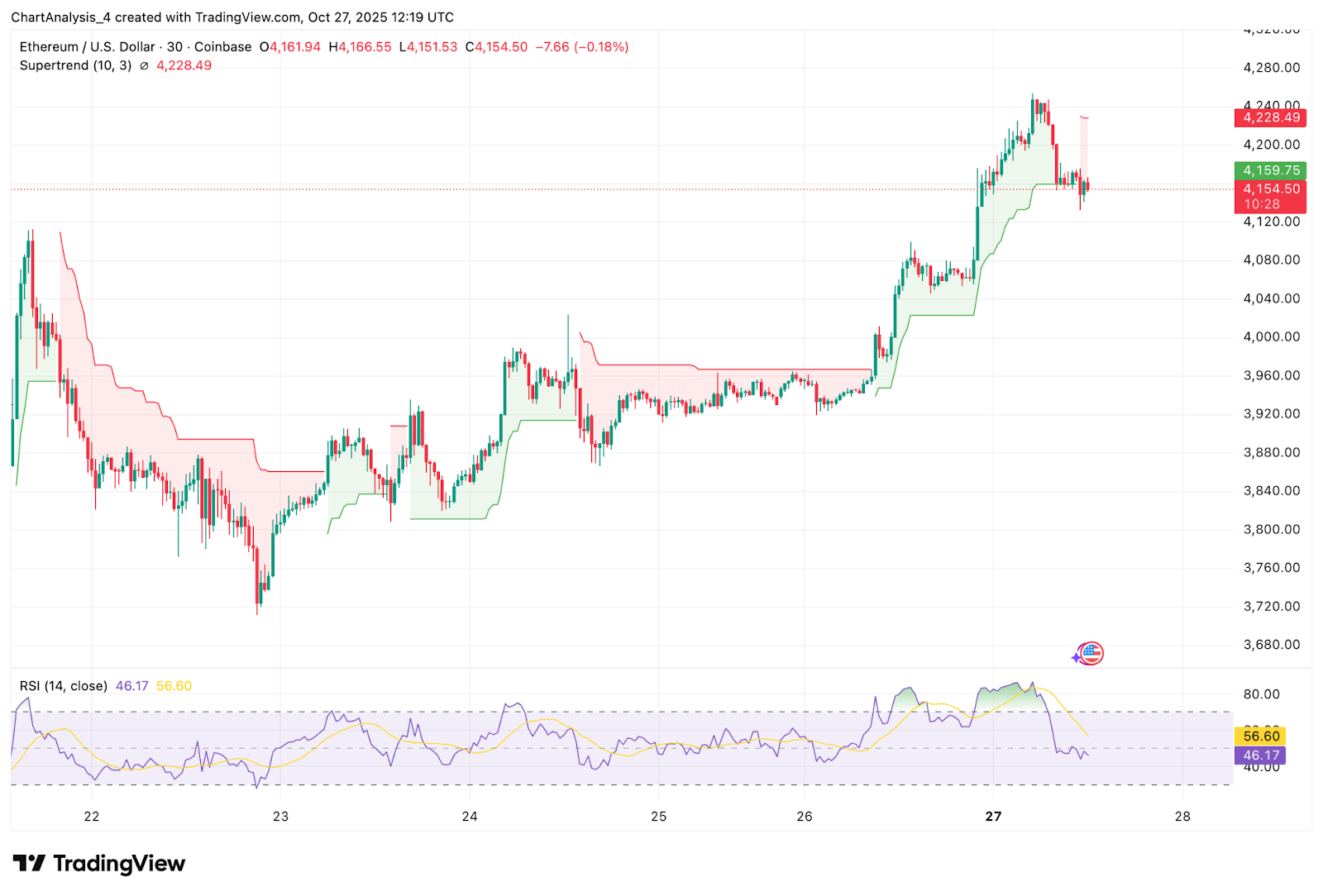Auf dem 30-Minuten-Chart ging der Ethereum-Preis leicht von seinem Intraday-Hoch von 4.228 $ zurück, wo der Supertrend-Indikator rückläufig war. Der RSI, der sich derzeit in der Nähe von 46 abkühlt, bestätigt einen kurzfristigen Verlust des Momentums nach einem überkauften Wert zu Beginn der Sitzung.